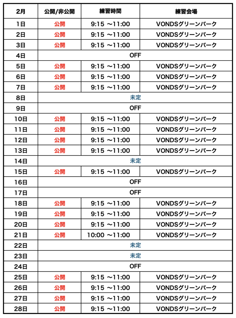 【TOP】トップチーム練習スケジュールについて(2/1〜2/28)