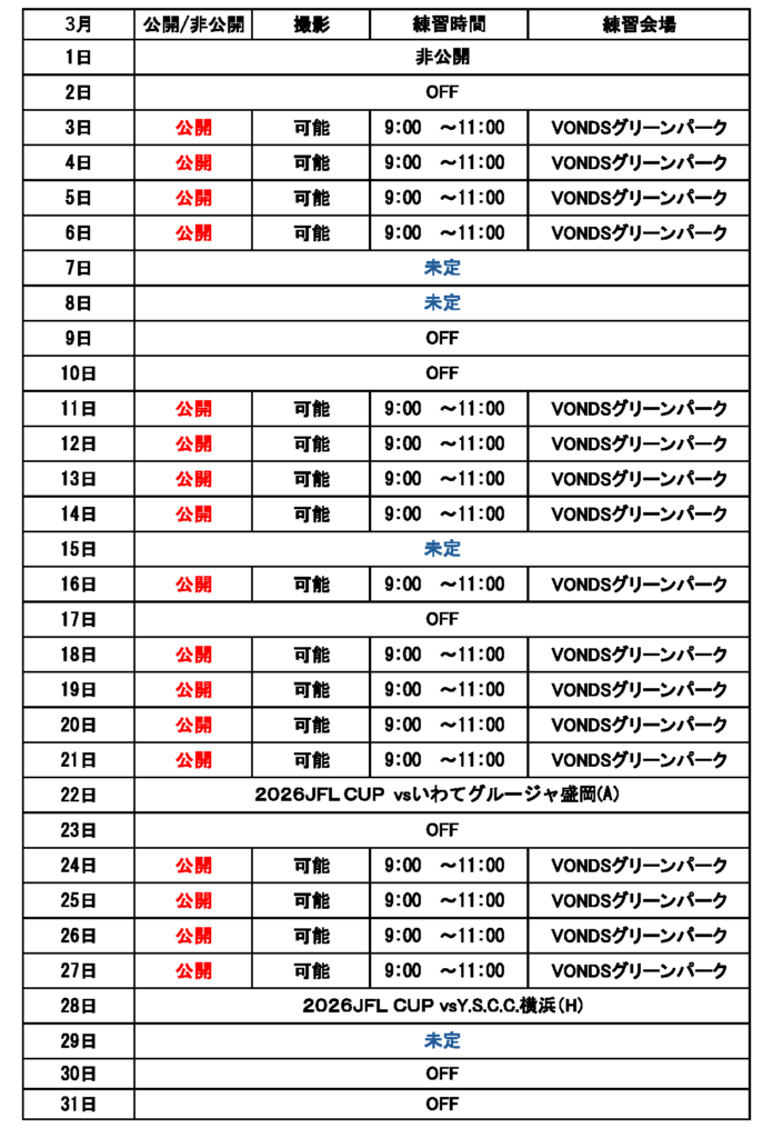 3/1(日)〜3/31(火)のトップチーム練習スケジュールについてお知らせいたします。