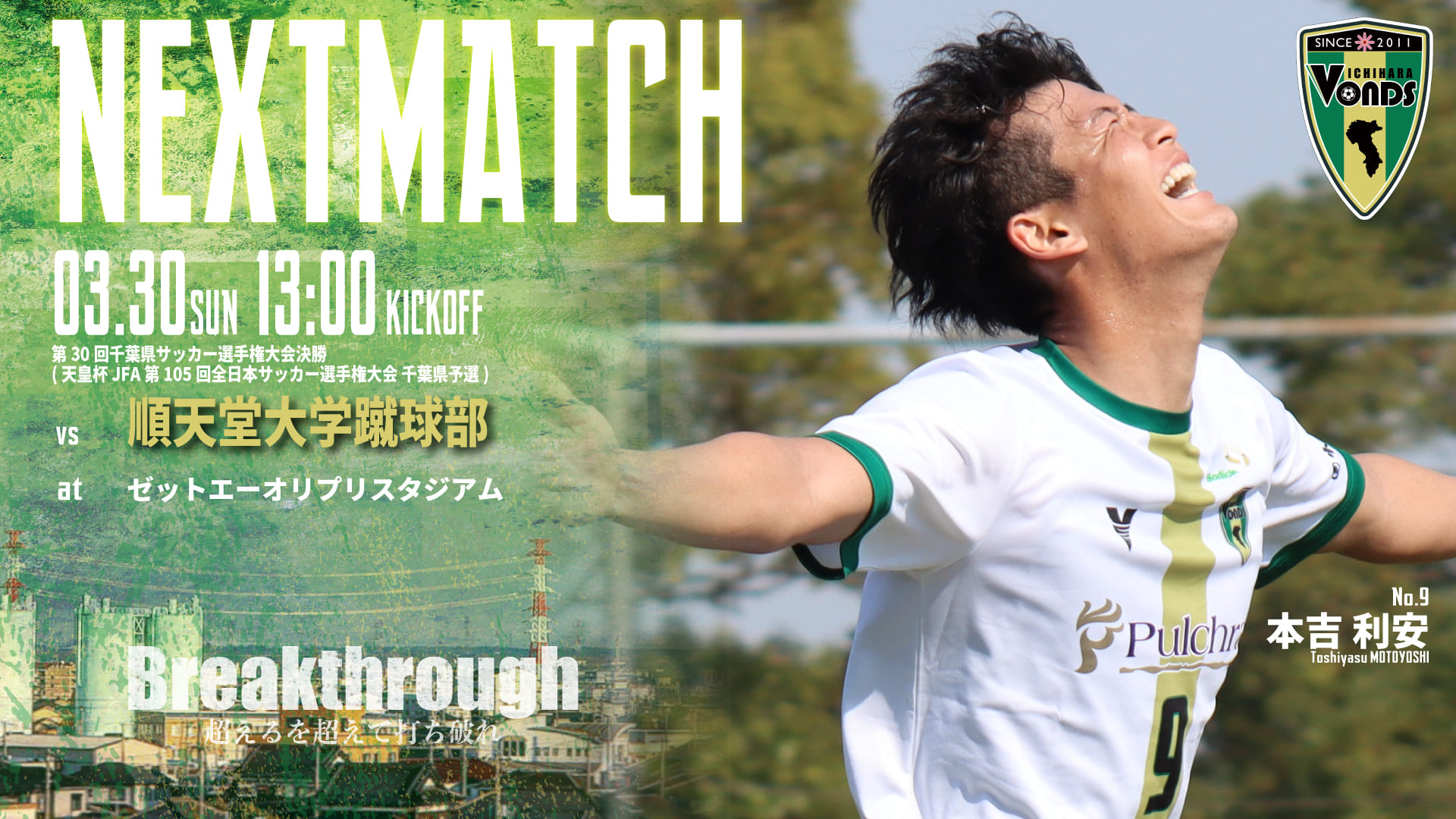 3/30(日)に開催予定の【第30回千葉県サッカー選手権大会(天皇杯 JFA 第105回全日本サッカー選手権大会 千葉県予選) 決勝 順天堂大学蹴球部】戦についてお知らせします。
