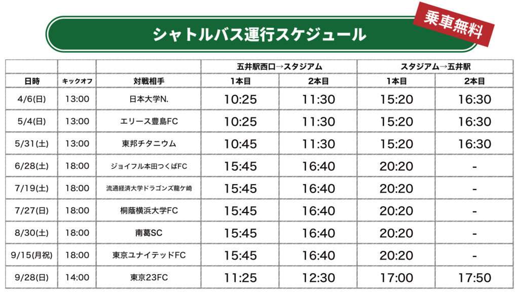 2025シーズン【第59回関東サッカーリーグ1部 VONDS市原FCホームゲーム開催日】にて、無料シャトルバス運行を行います。