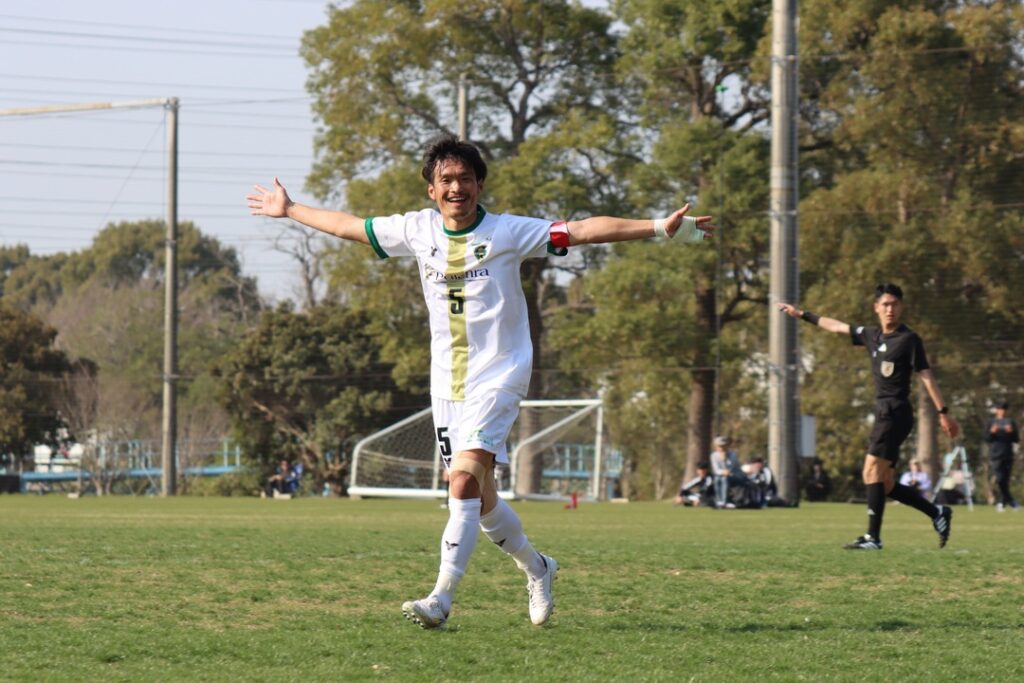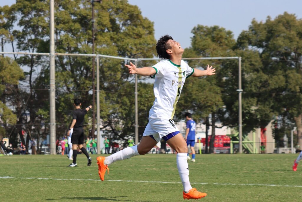 苦しい時間帯の中で生まれたゴールに勢いをつけたチームはその後も攻撃の手を緩めず、前半終了間際に、途中交代#13有永のロングボールに#9本吉が頭で合わせて追加点を挙げる!
