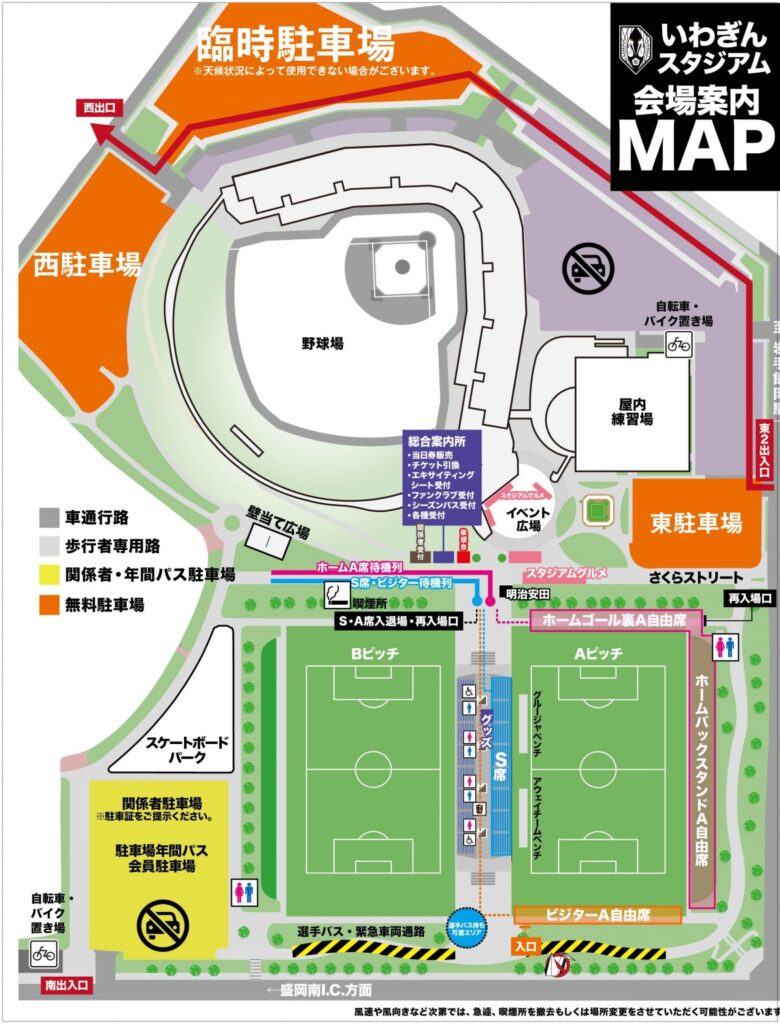 ・盛岡駅 ➔ 岩手飯岡駅(JR東北本線で約10分)岩手飯岡駅からスタジアムまでは徒歩で約15分(合計25分、料金250円)