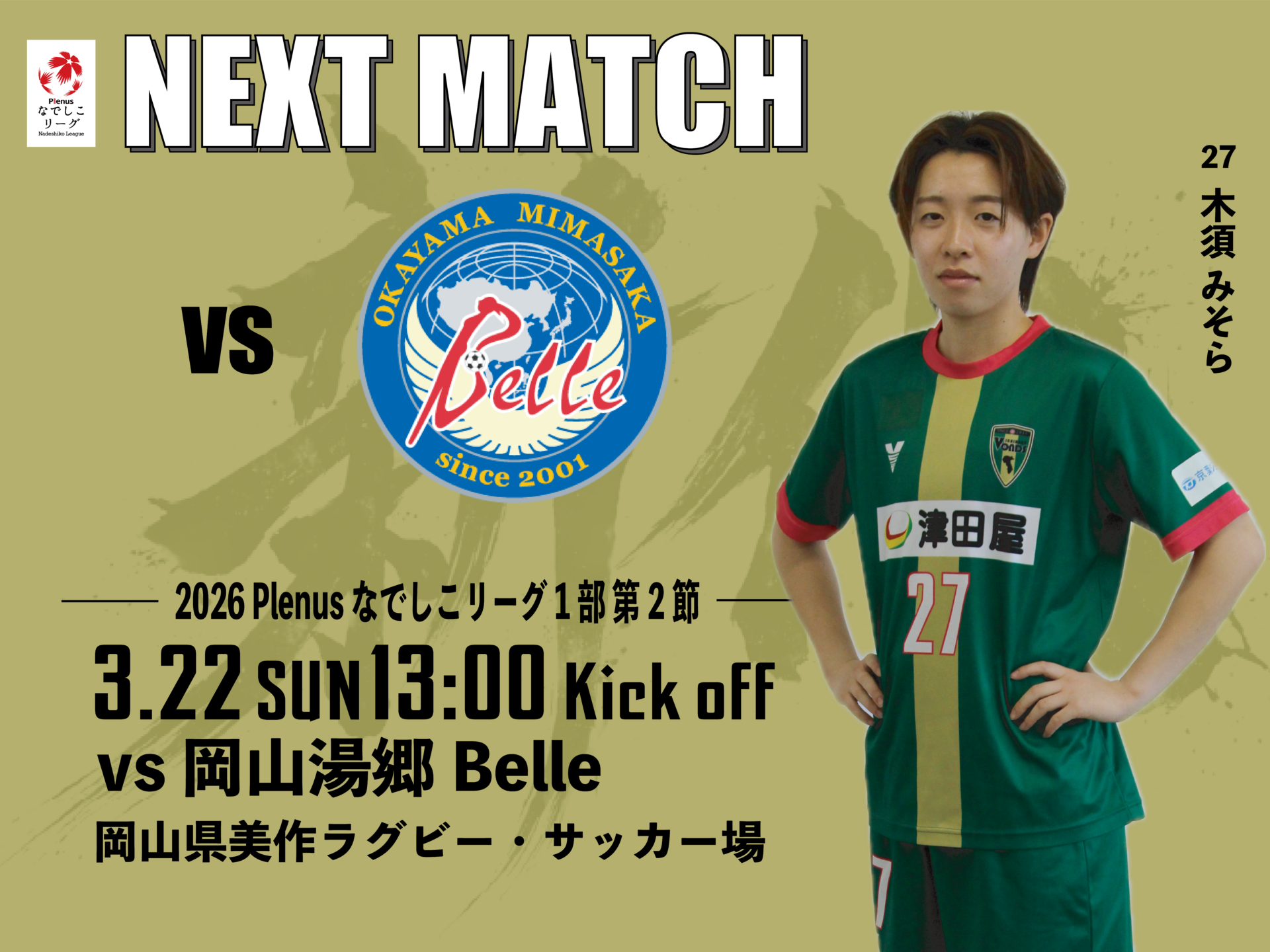 3/22(日)に開催予定の【2026プレナスなでしこリーグ1部 第2節 岡山湯郷Belle 戦】についてお知らせいたします。