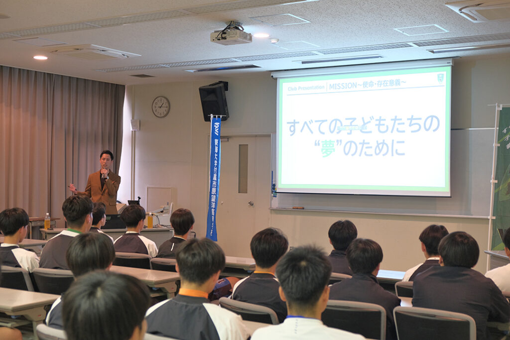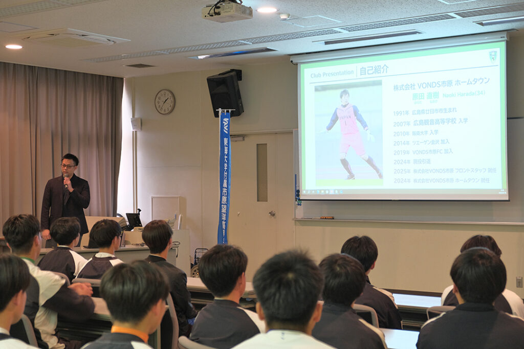 今回は、VONDS市原で選手としても活躍し、現在フロントスタッフとして活躍する小石哲也・原田直樹の両名が、90名を超える同校サッカー部員(新2・3年生)の方々に向けて「壁を乗り越えたその先に」というテーマでお話しさせていただきました。全国高等学校サッカー選手権大会に出場したこともある両名による、自身の経験を踏まえた発表に、参加した皆さんは真剣に耳を傾けていただき、質疑応答などでも積極的にご質問くださいました。