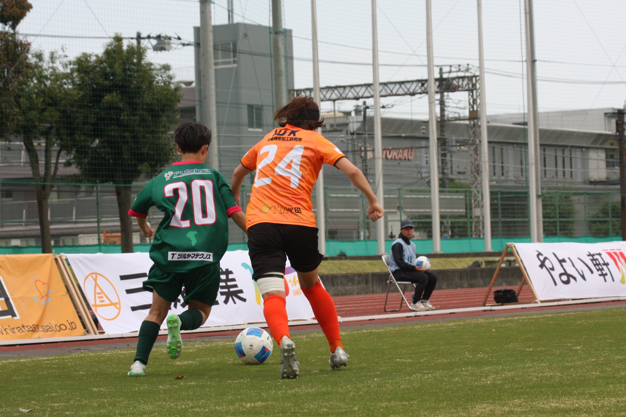 後半23分、#33上田がゴール目の前でボールを持つ。勝ち越しゴールかと思われ会場が沸いたが、相手DFのスライディングに阻まれ得点には結びつかなかった。