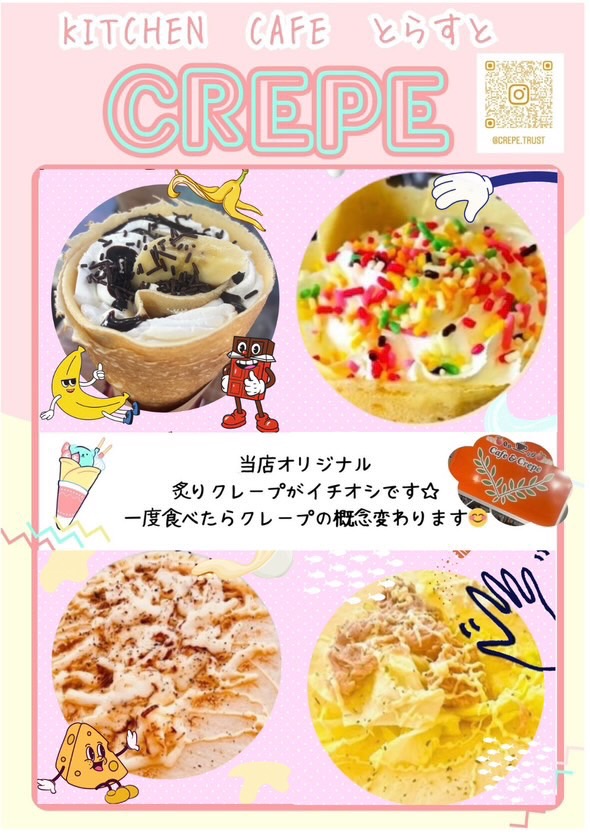 当店では惣菜クレープとデザートクレープでそれぞれ拘った生地を使用しております! 惣菜クレープはおかずの味を邪魔しない甘さ控えめのパリパリ食感⭐ デザートクレープはもちもち甘めの生地です! 炙りクレープはガスバーナーで炙ることにより香ばしさをプラスし香りでもクレープを楽しんで頂けるようお作りしてます♪是非ご賞味ください!