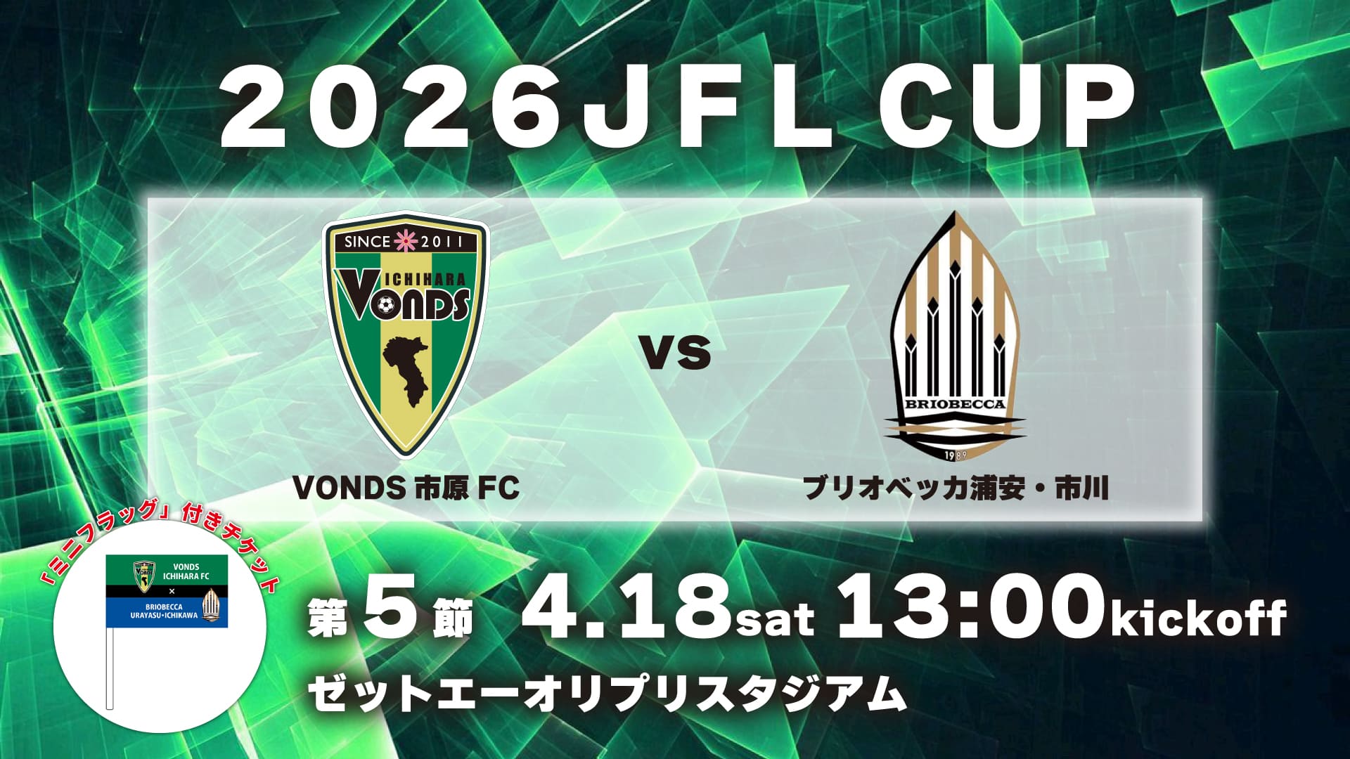 4/18(土)に開催予定の【2026JFL CUP】第5節 ブリオベッカ浦安・市川戦のチケット販売についてお知らせいたします。