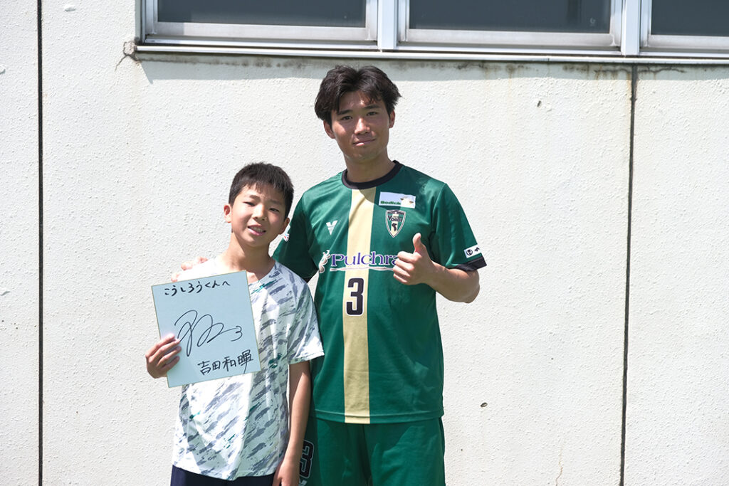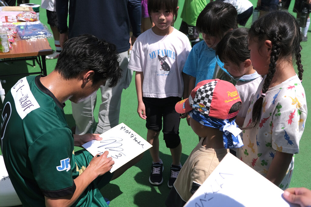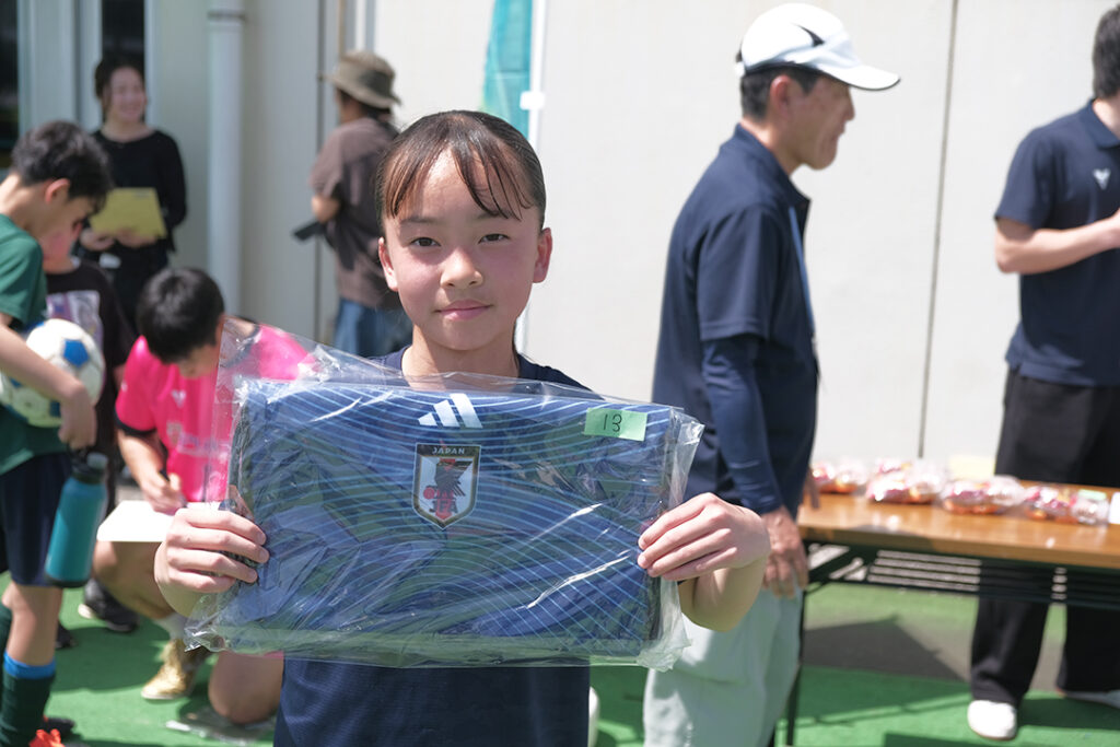試合前のピッチにて行われた2つのプログラム終了後には、参加した子どもたちを対象とした抽選会も行われました。参加した選手の中から好きな選手のサインをもらえるプレゼントは、子どもたちからも大好評!このほか、「サッカー日本代表サーモボトル」や「サッカー日本代表ジムバッグ」などの豪華景品が当選者に贈られました。