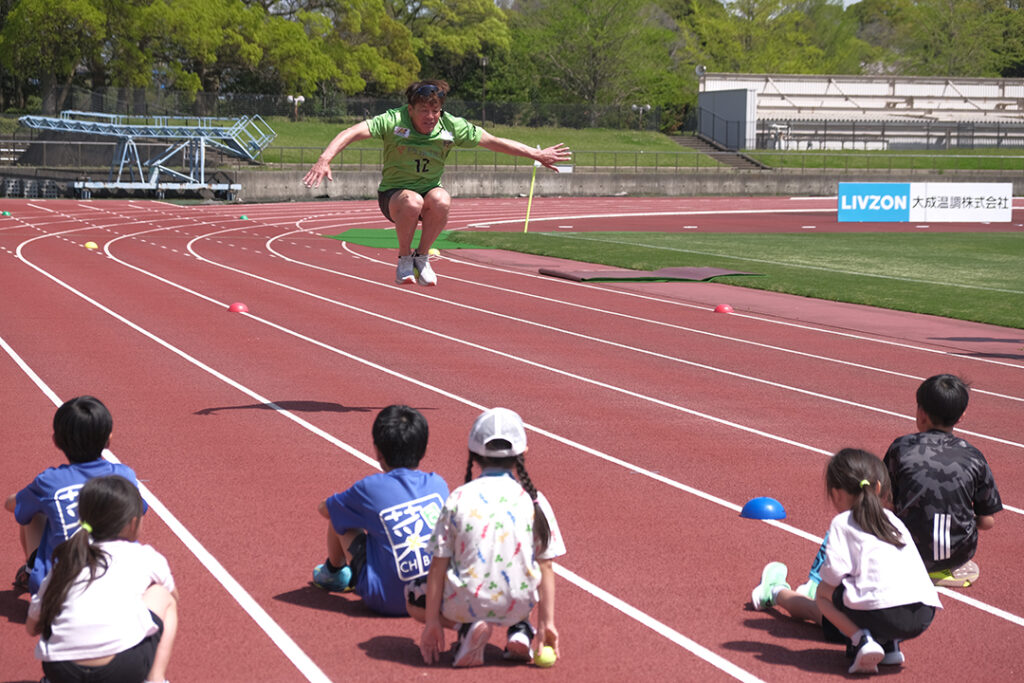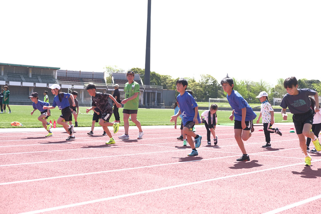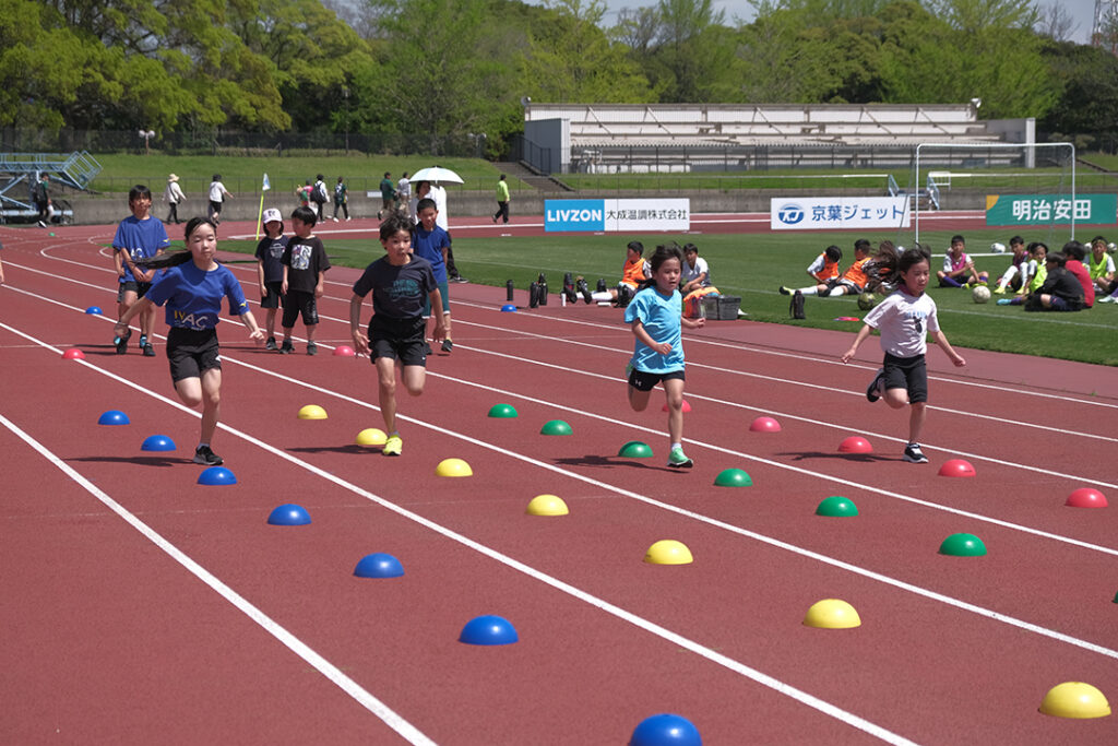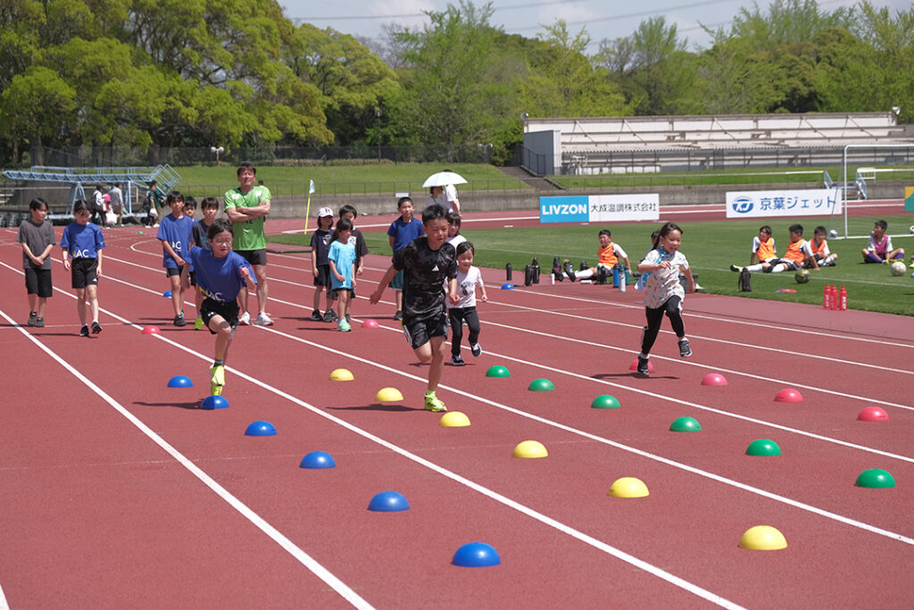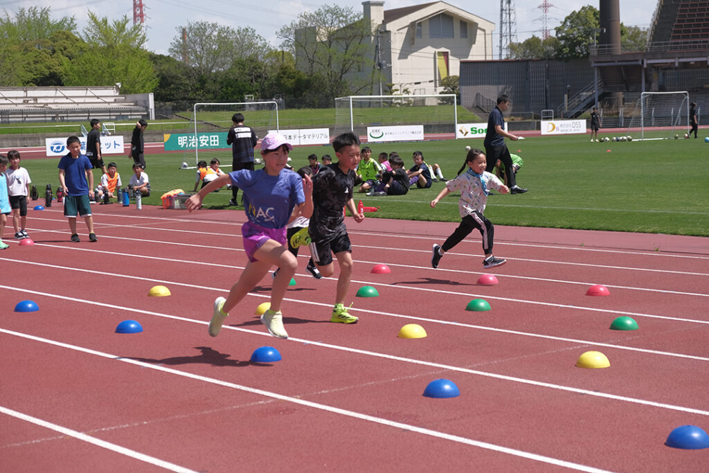 片足ステップやジャンプ、ボールを使ったトレーニングなど、参加した子どもたちは楽しみながら正しい走り方を学びました。
