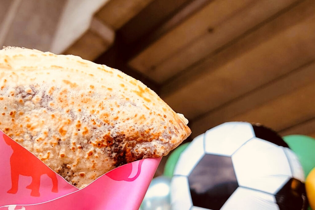 米粉を使用したもっちもち食感のクレープ。「チョコ生クリーム」(¥450)などの定番ものから、「シュガーバター」(¥400)や「ハムピザ」(¥550)といったホット&しょっぱい系クレープまで種類豊富なラインナップ!
