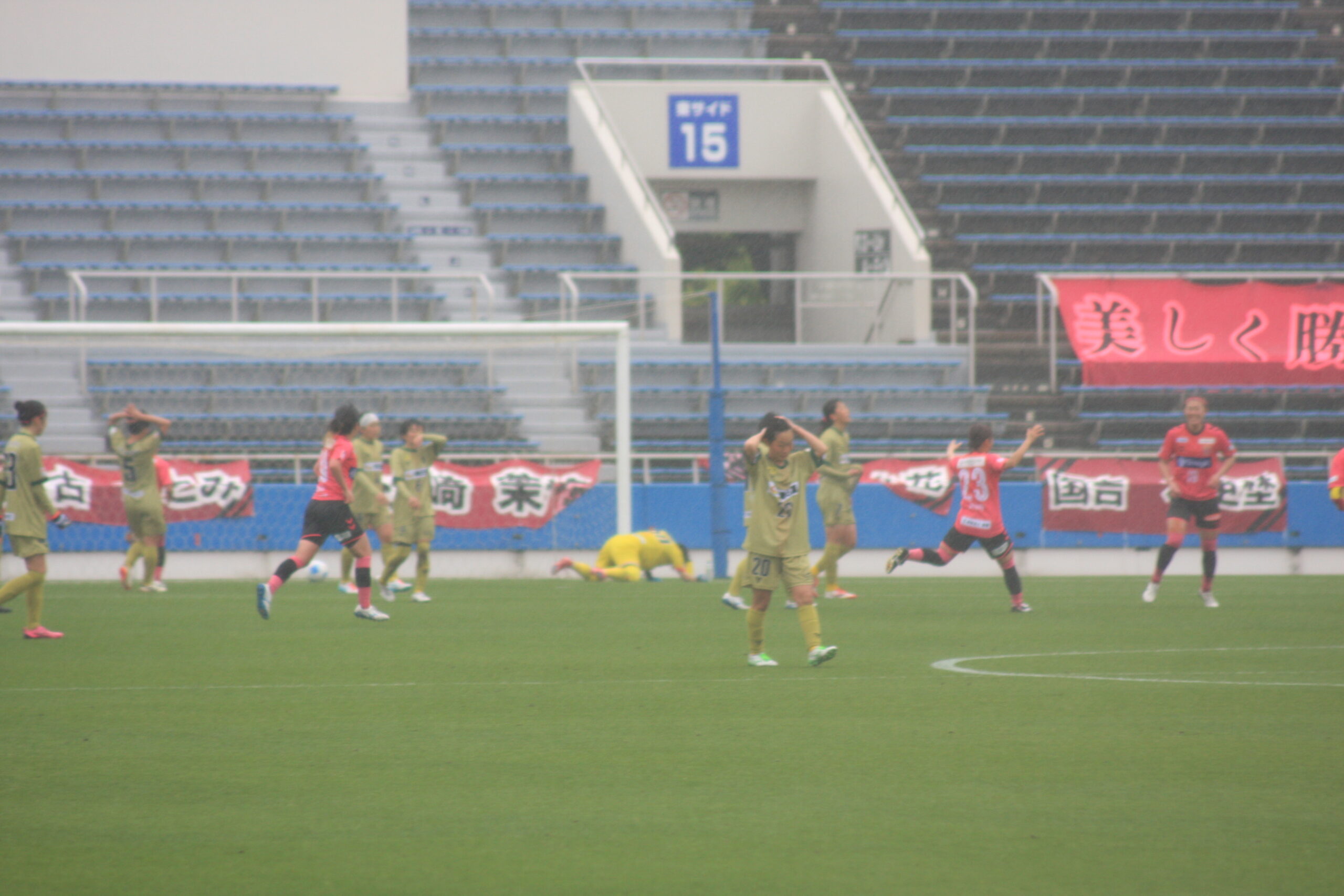 雨が降り注ぐ中、両チーム大きなミスもなく丁寧にボールを動かしながらゴールに向かおうとするが、