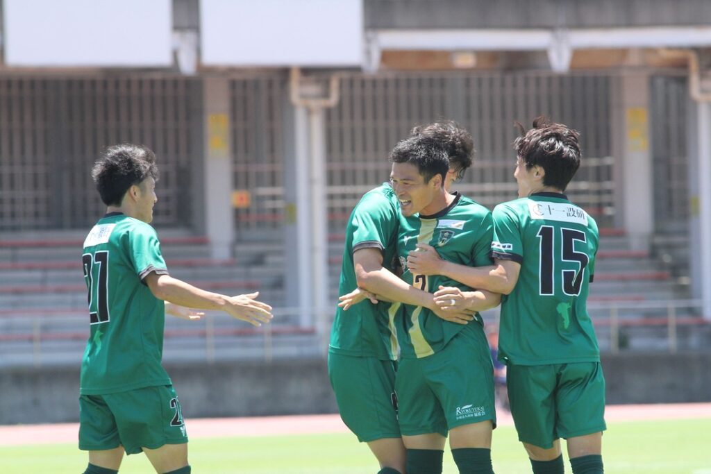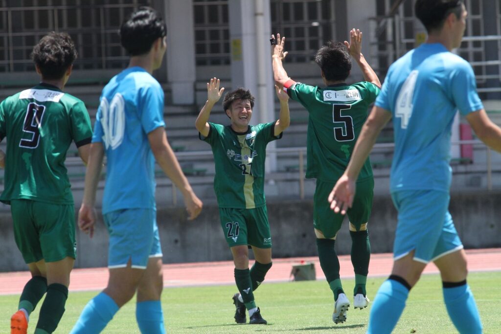 全国社会人サッカー選手権大会出場権獲得を賭けた最後の戦い・山梨学院大学PEGASUS戦をゼットエーオリプリスタジアムで迎える。気温が高く、厳しい日差しと強風が吹く中でキックオフ。前半12分、ロングスローから混戦になったところを最後はNo.2藤嵜がシュート!早々に先制点を挙げたチームは、前半26分にコーナーキックを獲得。No.19橋本からの低い位置に入れたボールにNo.27郡司が頭で合わせ、今季初ゴールを挙げる!