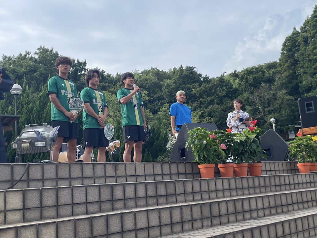 当日は、ふる里学舎 納涼祭のオープニングセレモニーから参加し、VONDS市原FC No.16勝浦太郎選手、No.23 後藤準弥選手、No.33 須藤栄二選手の3名がステージに登壇し、クラブ及びファン感謝祭(雨天のため開催中止)の紹介をさせていただきました。