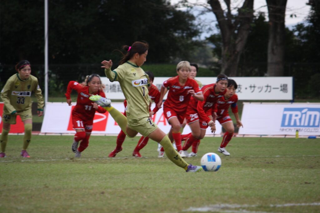 前半45分、#5小田川のクリアを#32増田がキープしてこぼれたボールを#7佐藤が拾う。そのままスピードに乗って運ぶと、得意な左足の前に置き振り抜く。低弾道のパワーあるシュートは会場を沸かせたが、相手GKのセーブでCKに。
