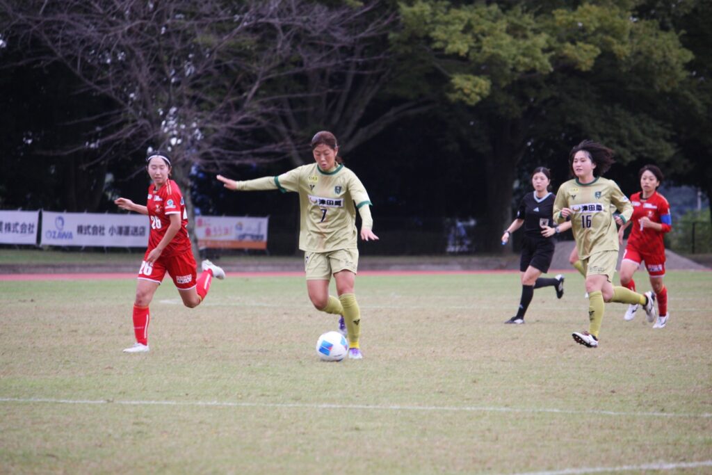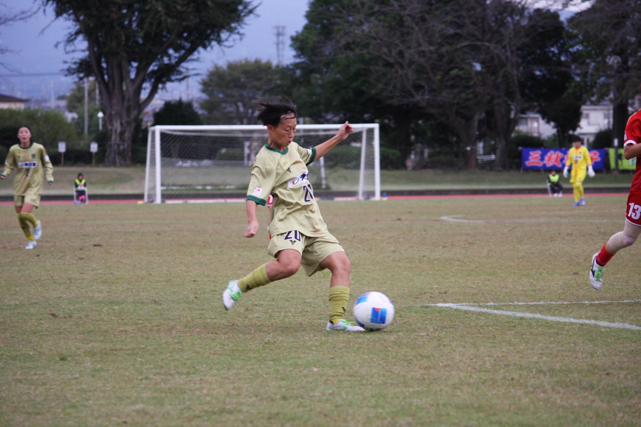 前半45分、#5小田川のクリアを#32増田がキープしてこぼれたボールを#7佐藤が拾う。そのままスピードに乗って運ぶと、得意な左足の前に置き振り抜く。低弾道のパワーあるシュートは会場を沸かせたが、相手GKのセーブでCKに。