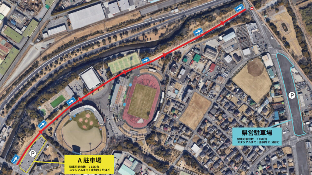 公式戦開催に合わせ、周辺道路に一方通行となる区間があります。