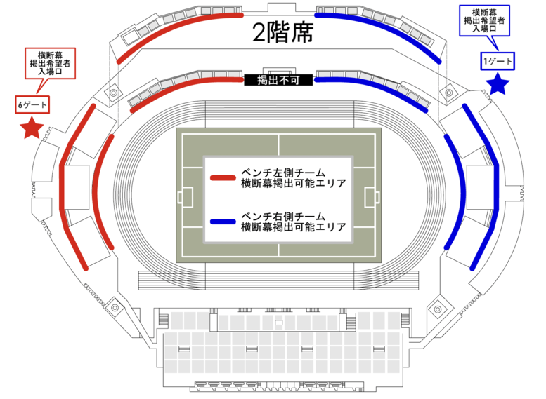 ・横断幕の掲出可能エリアは、バックスタンドならびにゴール裏の指定場所(下図参照)のみです。メインス