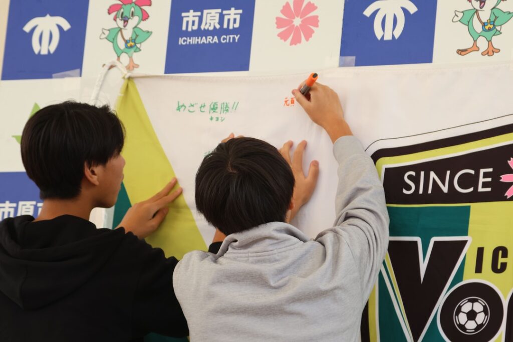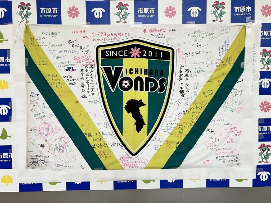 アリオ市原 1F サンシャインコート屋外にて、VONDS市原FC応援フラッグを掲示し、チームへの応援メッセージブースを設置しました。ご来場いただいた皆さまをはじめ、小出讓治市原市長、稲垣英明市原市副市長、髙澤良英市原市副市長、藤谷誠市原市教育長より激励をご寄稿いただきました。