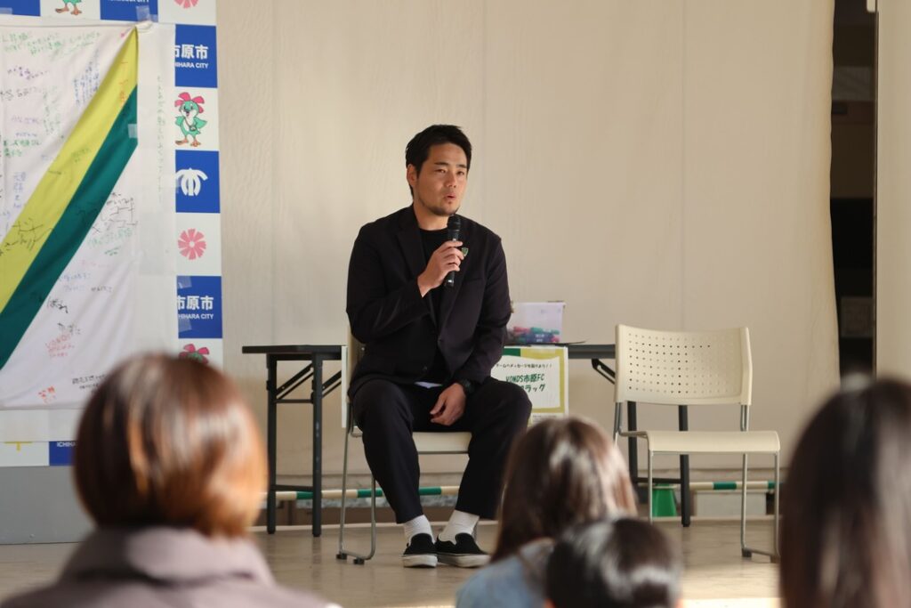 14時から行われたトークショーでは、代表取締役社長 佐藤健が登壇。今シーズンの関東サッカーリーグ1部での戦いや、2017年にゼットエーオリプリスタジアムで行われた全国地域サッカーチャンピオンズリーグを振り返りました。「当時のこと、思いは一生忘れられない」と語り、続けて「今年、市原でJFL昇格することは決まっている。そういった運命的なものを感じます。苦しいこと、辛いことを乗り越えてきた選手たちがJFL昇格するため、選手たちがあと一歩を踏み出すためのエールを送って欲しい」と話しました。
