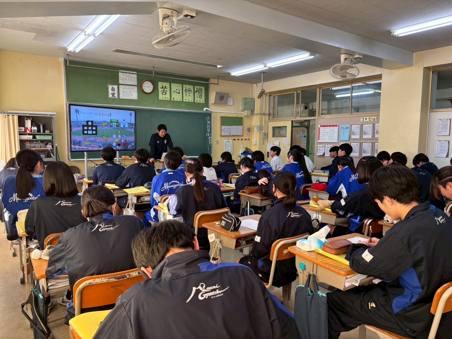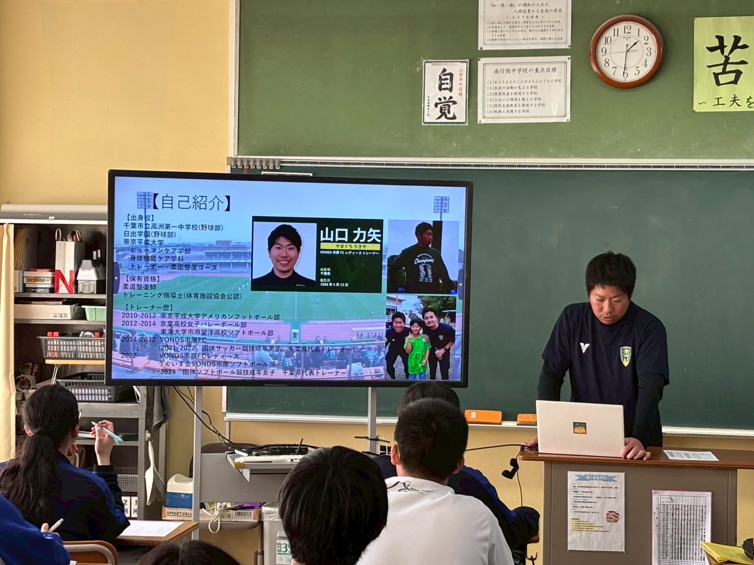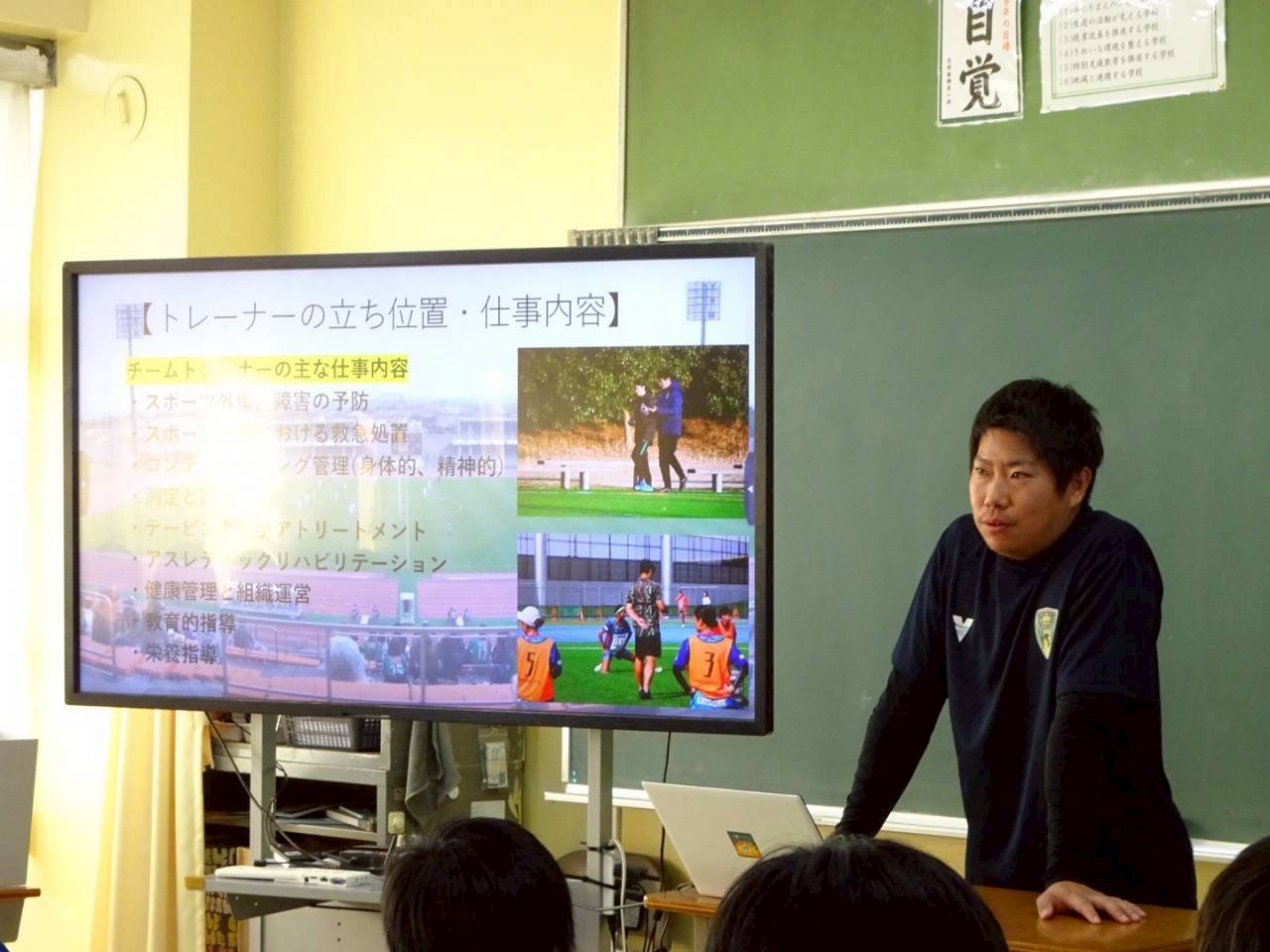 11月14日(金)、VONDS市原FCレディースの山口力矢トレーナーが、市川市立南行徳中学校を訪問し、『スポーツトレーナーの仕事について』生徒の皆様に向けて職業講話を実施いたしました。