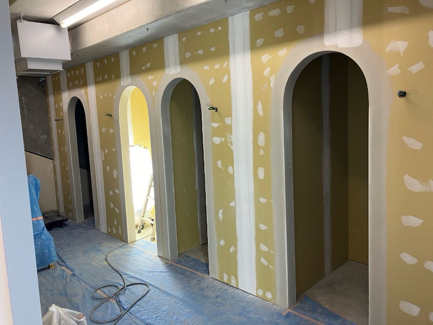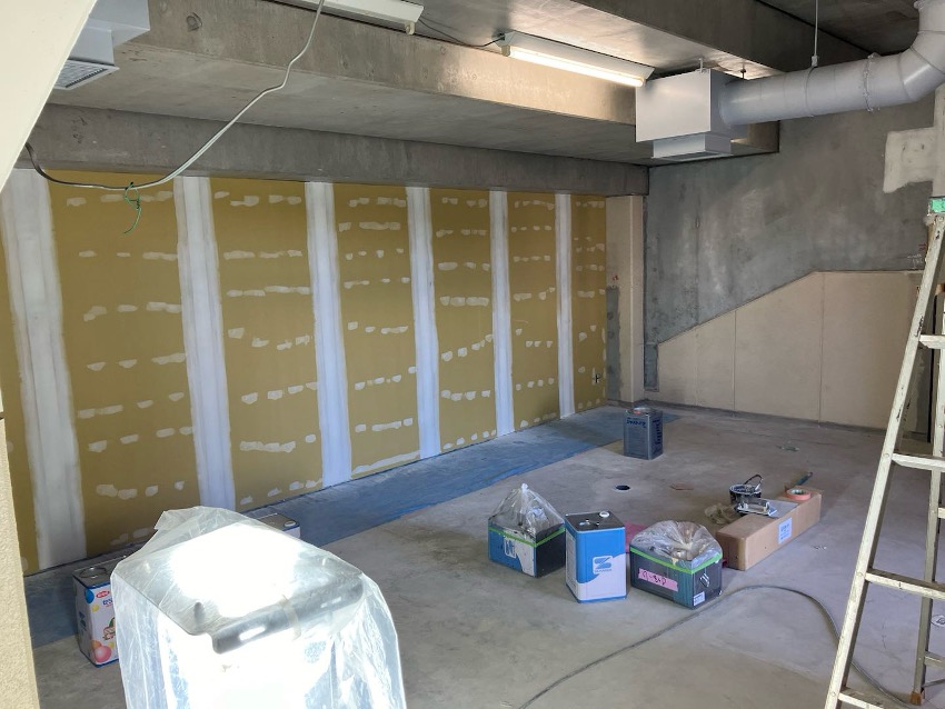 内装が進み、外壁にはグリーンとブラックを基調とした空間になり、さらに全面ガラス扉が設置されました。